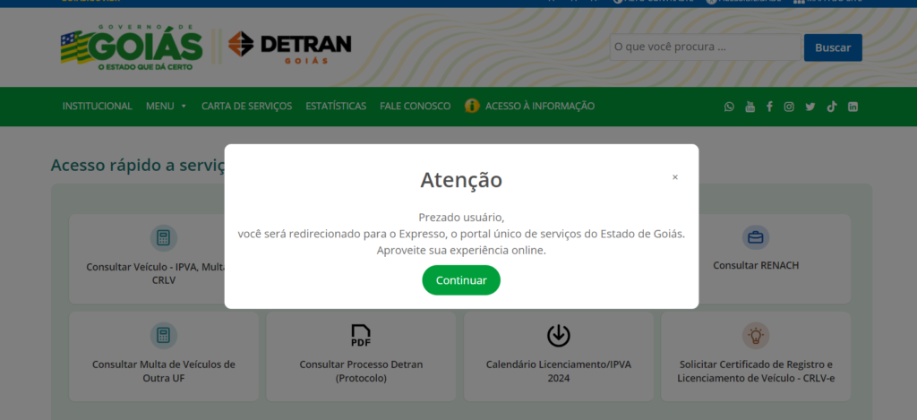 2. No Menu Superior acesse a opção “Consultar Veículo – IPVA, Multas e CRLV” você será redirecionado para o Expresso, o portal único de serviços do Estado de Goiás.