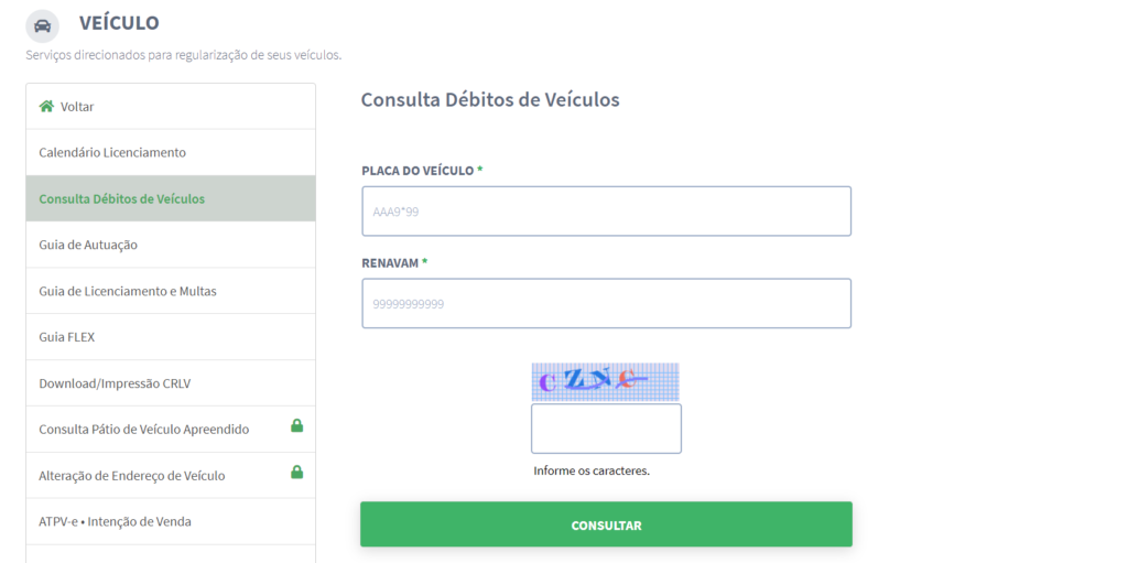 - No Menu lateral esquerdo, selecione a opção “Consulta Débitos de Veículos”.